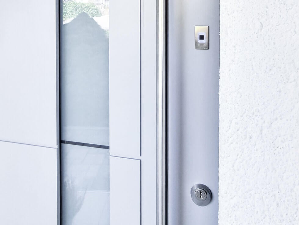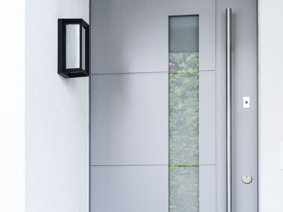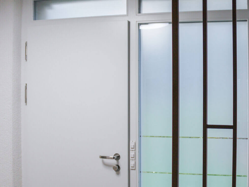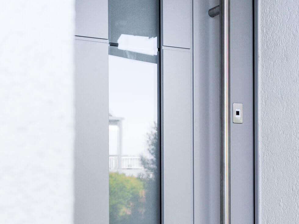 Die weisse Tür mit einem grossen, bogenförmigen Glasausschnitt integriert sich harmonisch in das klassische Erscheinungsbild des Hauses und sorgt gleichzeitig für einen hellen, einladenden Eingangsbereich.